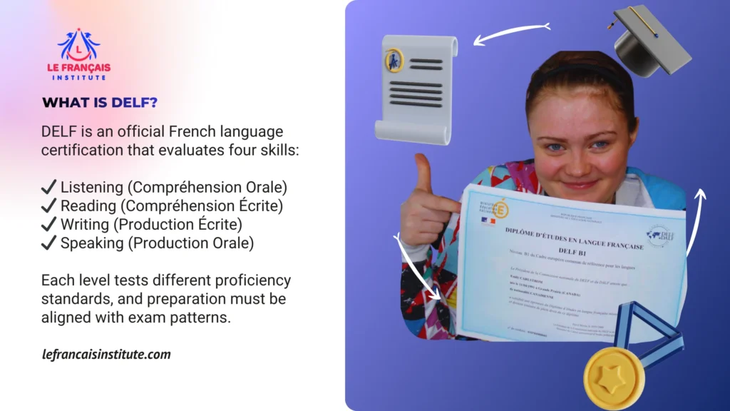 DELF (Diplôme d’Études en Langue Française) is an internationally recognized French diploma awarded by the French Ministry of Education. It is accepted worldwide for education, career opportunities, and immigration purposes.